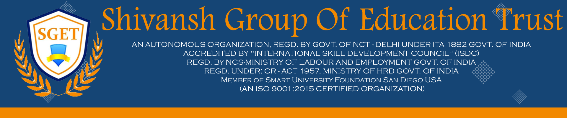 Welcome To Shivansh Group Of Education Trust AN AUTONOMOUS ORGANIZATION, REGD. BY GOVT. OF NCT - DELHI UNDER ITA 1882 GOVT. OF INDIA ACCREDITED BY "INTERNATIONAL SKILL DEVELOPMENT COUNCIL" (ISDC) REGD. By NCS-MINISTRY OF LABOUR AND EMPLOYMENT GOVT. OF INDIA REGD. UNDER: CR - ACT 1957, MINISTRY OF HRD GOVT. OF INDIA Member of Smart University Foundation San Diego USA. (AN ISO 9001:2015 CERTIFIED ORGANIZATION)